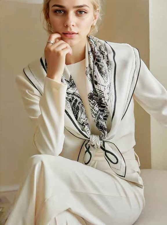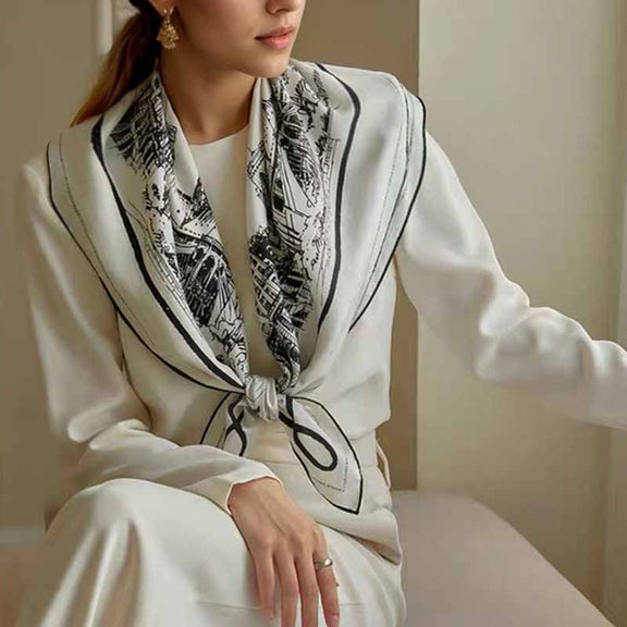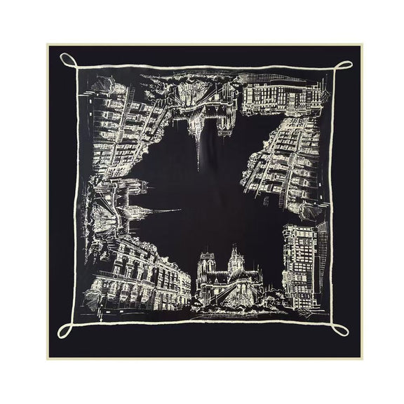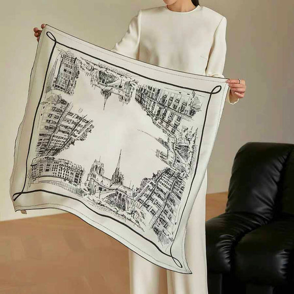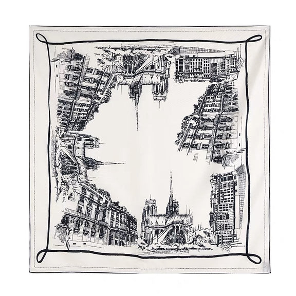 The luxurious silk and urban sketch design of this scarf bring a blend of fashion and timeless elegance. Elevate your everyday look with this sophisticated accessory that adds a touch of refinement and enhances your lifestyle.